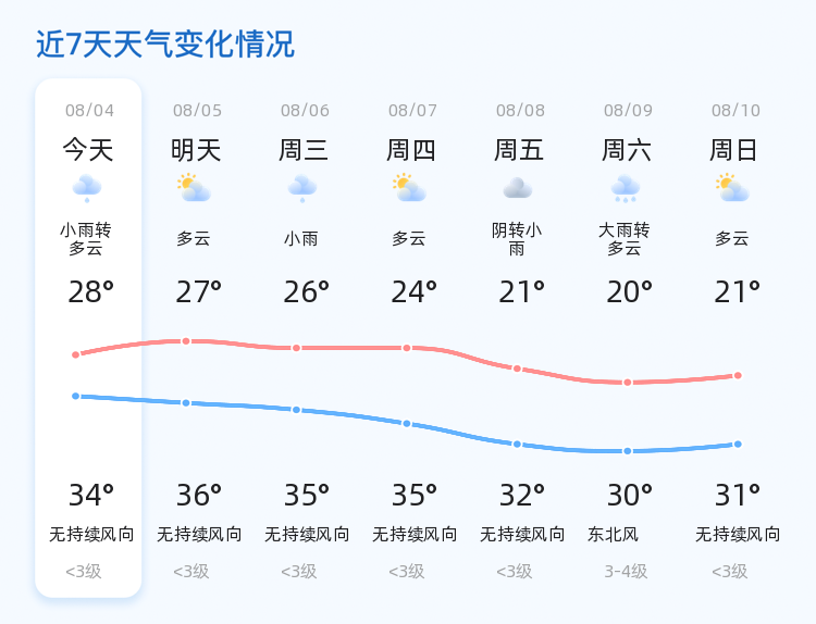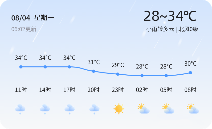 今天是8月4日,星期一,农历润六月十一。枣庄市今日天气为小雨转多云,气温在28℃至34℃之间。目前实时温度为28.2℃,湿度较高,为88%,空气质量良好,PM2.5指数为49。今日风力较小,北风0级,适合市民外出活动。各区天气情况基本一致,均为小雨转多云,市民需注意携带雨具,防范短时降雨。