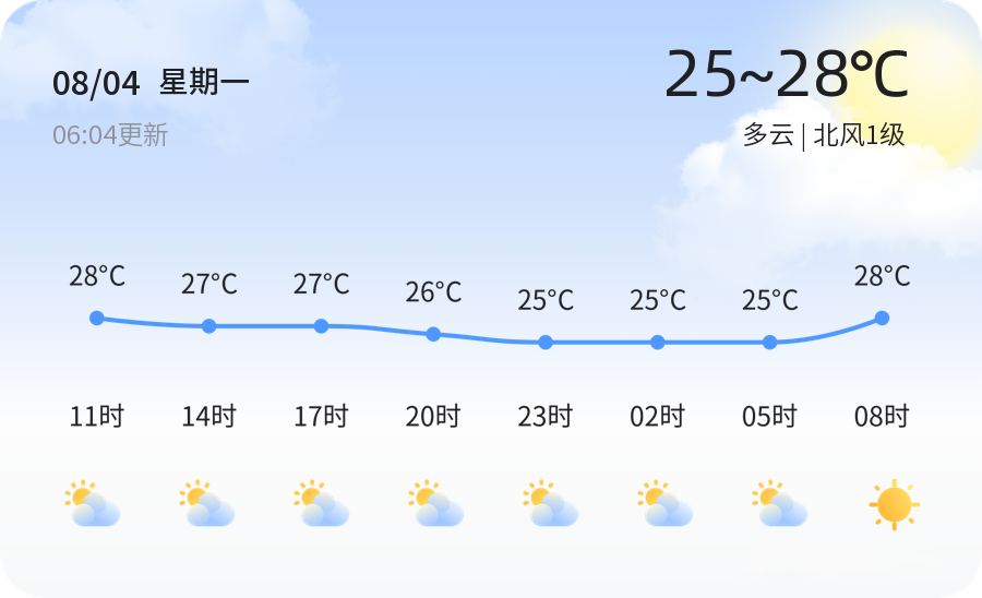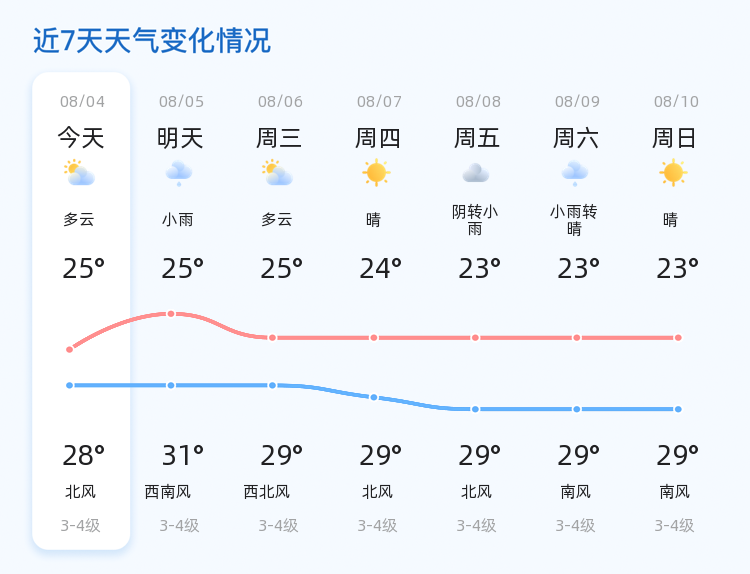 今天是8月4日,星期一,农历润六月十一。烟台市今天以多云天气为主,气温适中,全市大部分地区最高气温28℃,最低气温25℃。目前,烟台市实时气温25.6℃,北风1级,空气湿度87%,PM2.5指数16,空气质量优,适合户外活动。