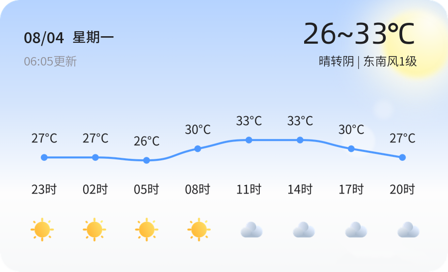 今天是8月4日,星期一,农历润六月十一。潍坊市今日天气晴转阴,气温介于26℃至33℃之间,东南风1级,空气湿度高达98%,PM2.5浓度为26,空气质量等级为优。由于湿度较大,体感闷热,市民出行时应注意防晒补水,避免中暑。建议市民尽量选择早晚出行,避免高温时段长时间户外活动。