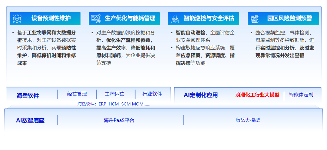 浪潮海岳大模型-Ch1版搭建“大模型基座-垂域大模型-智能体应用”的三层功能体系,以浪潮海岳PaaS平台和海岳大模型为数智底座,采用“判别式AI+生成式AI”的复合式AI架构,基于服务化工行业积累的专业数据及知识,融合行业知识体系、工艺机理与企业运营数据,开展模型训练和能力调优,形成设备预测性维护、生产优化与能耗管理、智能巡检与安全评估、化工园区风险监测预警等核心能力;深度依托多模态感知融合与智能决策优势,提供面向化工领域的“工艺参数优化-设备故障预警-安全风险防控”一体化解决方案。
