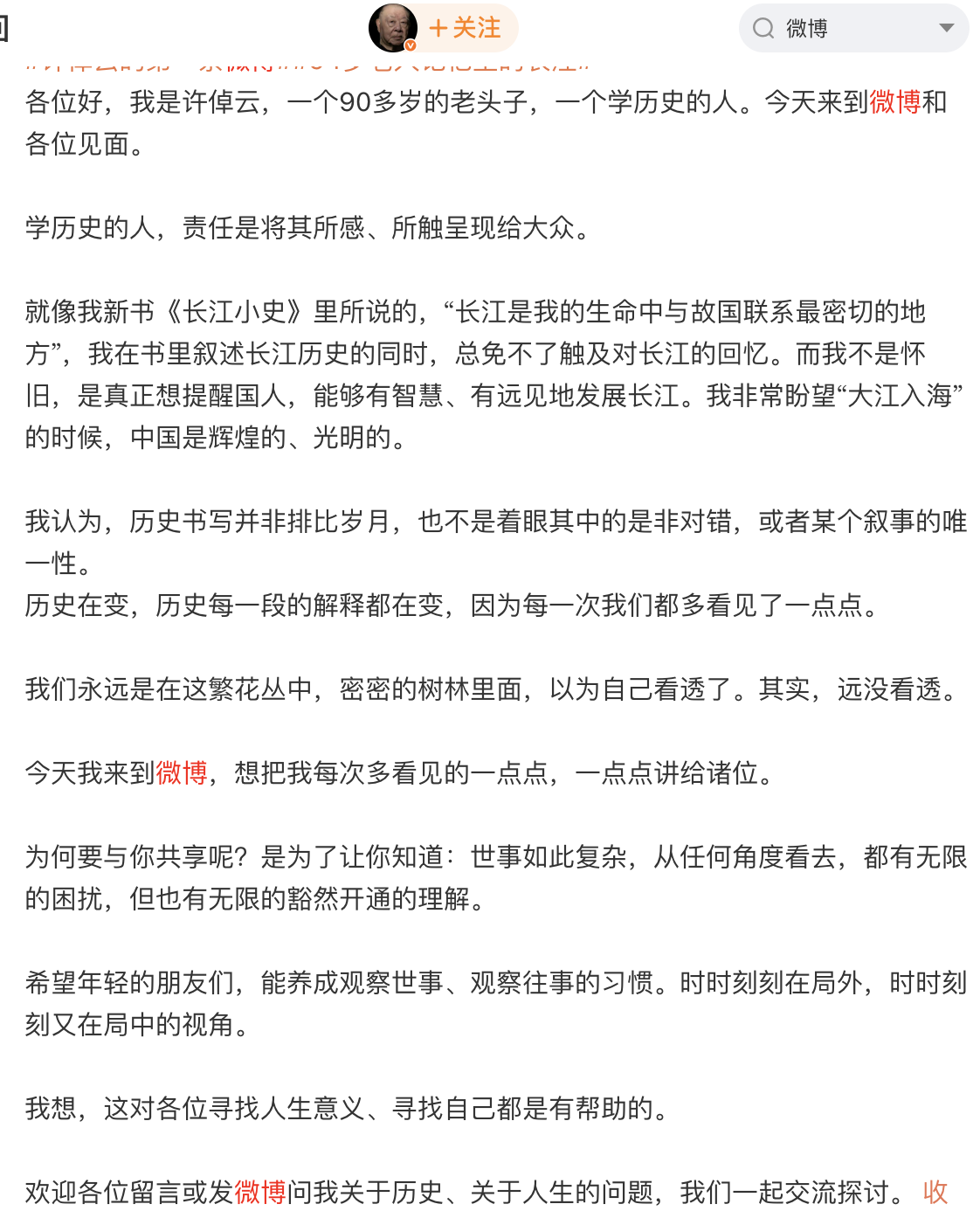 2024年4月23日,他入驻微博并发布首条推文,指出学历史的人,责任是将其所感、所触呈现给大众。希望年轻的朋友们,能养成观察世事、观察往事的习惯。时时刻刻在局外,时时刻刻又在局中的视角。欢迎大家与他交流探讨历史、人生问题。