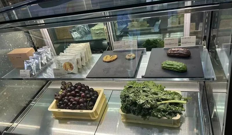 一喜茶门店的玻璃柜台内摆放着羽衣甘蓝等食材。