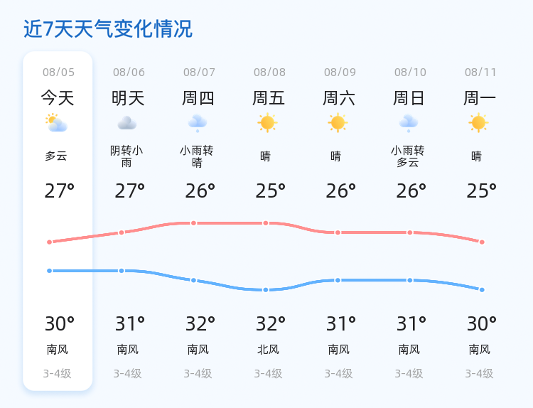 今天是8月5日,农历润六月十二,青岛市迎来了一天的多云转阴天气。全市各区气温较为平稳,最高气温30℃,最低气温27℃,南风2级,空气湿度较高,达到97%,PM2.5指数为20,空气质量良好。市民在享受夏日清凉的同时,也需注意防范局地可能出现的短时阴云天气。