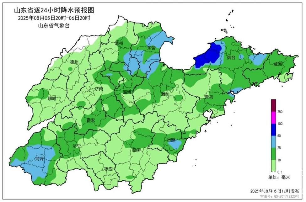 预计,5日傍晚到夜间,全省天气阴,聊城、德州、滨州、东营、济南、淄博、潍坊、青岛北部和烟台有中到大雨局部暴雨或大暴雨并伴有雷电,其他地区有雷雨或阵雨,雷雨地区雷雨时阵风7~9级局部10级以上。