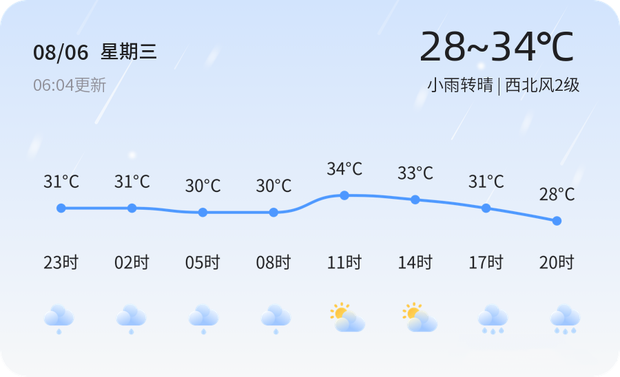 今天是8月6日,星期三,农历润六月十三。济宁市今日天气为小雨转晴,气温介于28℃至34℃之间,西北风2级,空气湿度91%,PM2.5浓度为36,空气质量状况为优。市民出行请注意携带雨具,防范短时强降水和雷雨阵风,建议密切关注气象预警信息,确保出行安全。