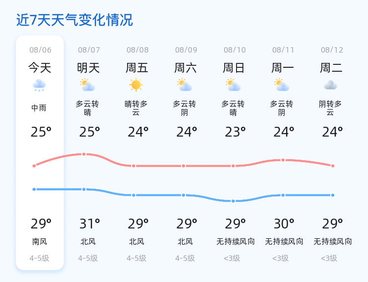 明日8月7日,星期四,威海市天气将转为多云转晴,气温较今日有所回升,预计在25℃至31℃之间,北风风力增强至4-5级。市民需注意防范大风天气带来的影响,出行时尽量避免在高楼之间快速穿行,以防风力过大造成危险。