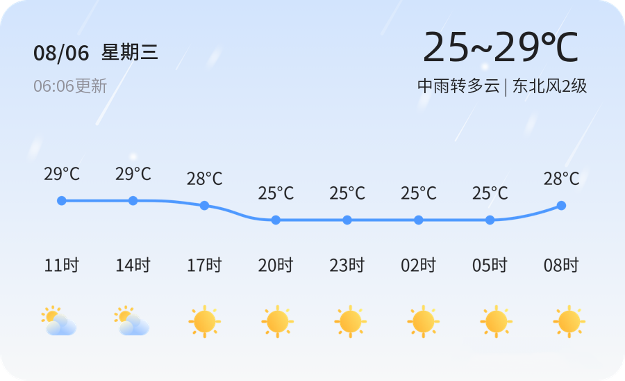 今天是8月6日,星期三,农历润六月十三。威海市今日天气以中雨转多云为主,气温在25℃至29℃之间,东北风2级,空气湿度较高,为94%。全市各区均以中雨转多云天气为主,市民出行需携带雨具,注意防雨防风。