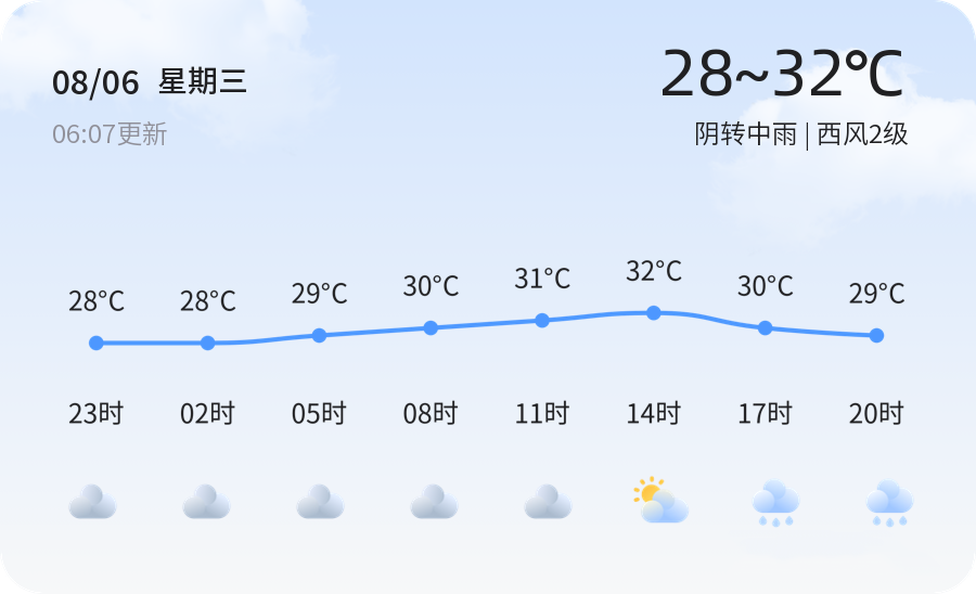 今天是8月6日,农历润六月十三,星期三。今日日照市天气阴转中雨,气温28℃到32℃,西风2级,空气湿度94%,空气质量为良好。预计今日降雨将逐渐增强,市民出行请注意携带雨具,注意交通安全。