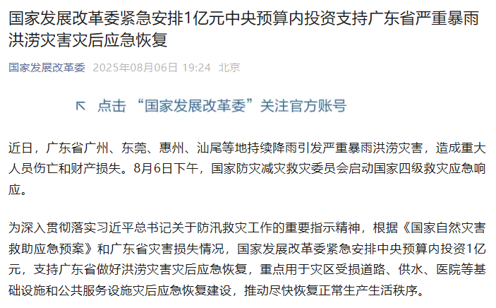 为深入贯彻落实习近平总书记关于防汛救灾工作的重要指示精神,根据《国家自然灾害救助应急预案》和广东省灾害损失情况,国家发展改革委紧急安排中央预算内投资1亿元,支持广东省做好洪涝灾害灾后应急恢复,重点用于灾区受损道路、供水、医院等基础设施和公共服务设施灾后应急恢复建设,推动尽快恢复正常生产生活秩序。