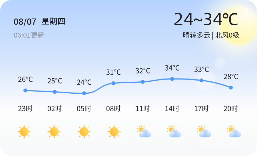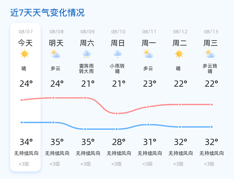 今天是8月7日,星期四,农历润六月十四。今日迎来二十四节气中的立秋,标志着季节从夏到秋的过渡。淄博市今天天气晴转多云,气温适中,最高气温34℃,最低气温24℃,北风0级,空气湿度100%,PM2.5指数46,空气质量良好。各区县天气情况总体平稳,以晴转多云为主,适合市民户外活动。