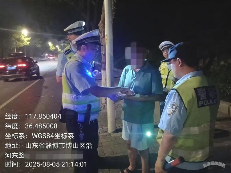 8月5日21时许,淄博市公安局交通管理支队博山区大队山头中队在沿河西路神头桥路段开展夜查行动过程中,一辆悬挂有鲁CMZ2**号牌的普通二轮摩托车在临近检查点时突然靠边停车,驾驶人匆忙下车行至路边,执勤民警发现情况后立即上前询问情况。