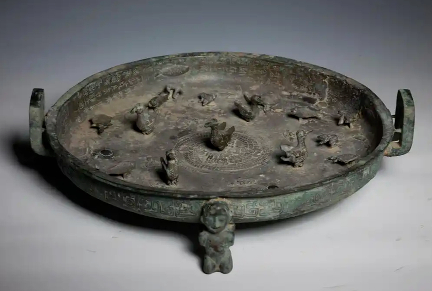 晋公盘,山西博物院藏。春秋五霸之一晋文公为女儿孟姬打造的媵器,盘中的小动物都可以360度旋转,鸟嘴还可以开合。