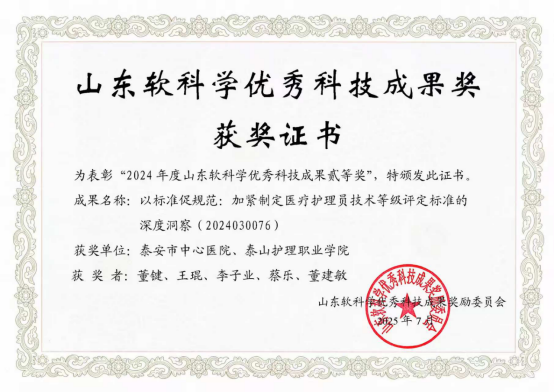 近日,山东软科学优秀科技成果奖励委员会公布了2024年度“山东软科学优秀科技成果奖”评选结果,由泰安市中心医院(青岛大学附属泰安市中心医院、泰山医养中心)为第一完成单位、董键为首位完成人的《以标准促规范:加紧制定医疗护理员技术等级评定标准的深度洞察》(项目编号:2024030076)荣获二等奖,这是目前泰安市中心医院在省级软科学课题奖项中获得的最高等级学术成果。