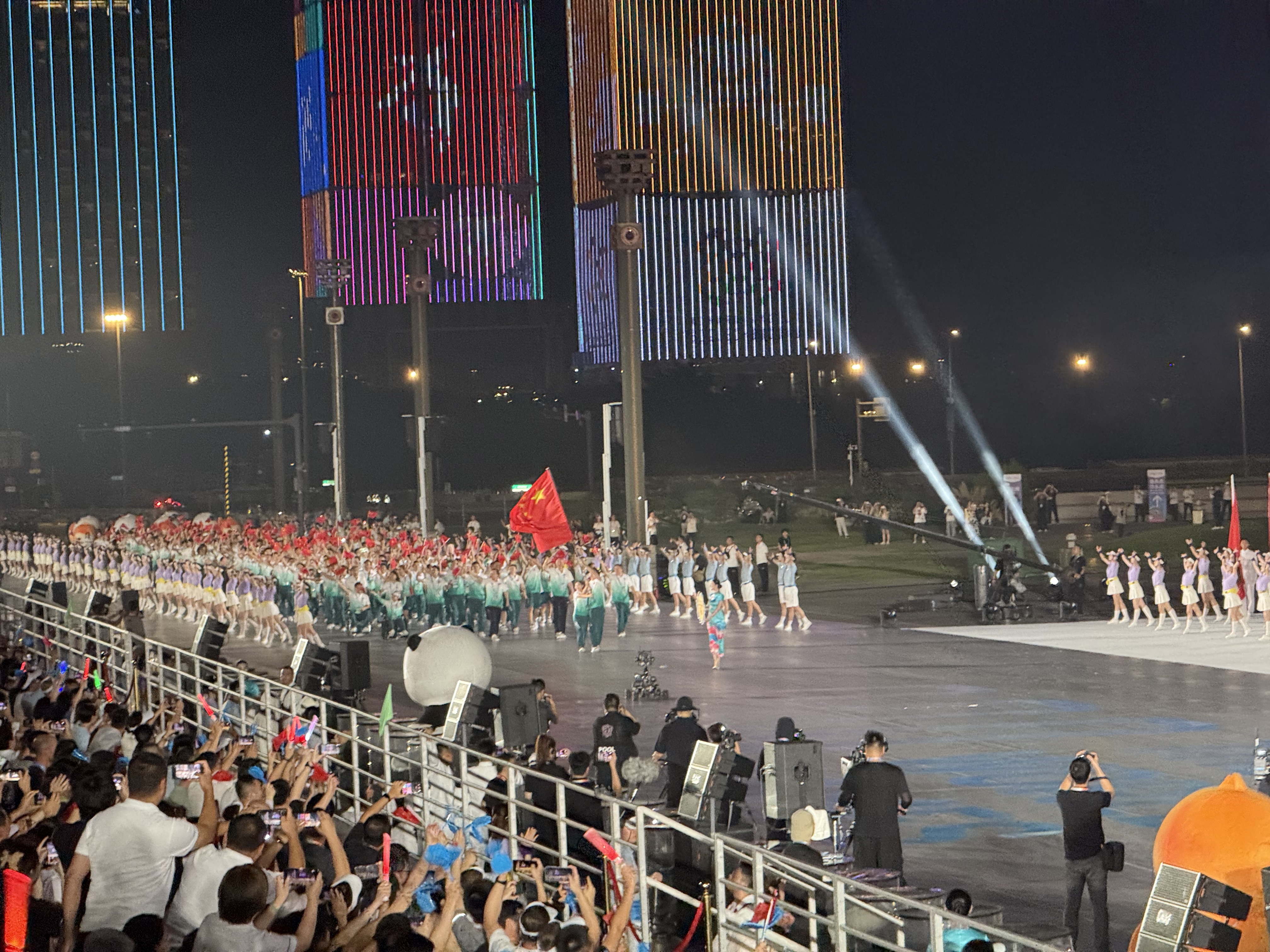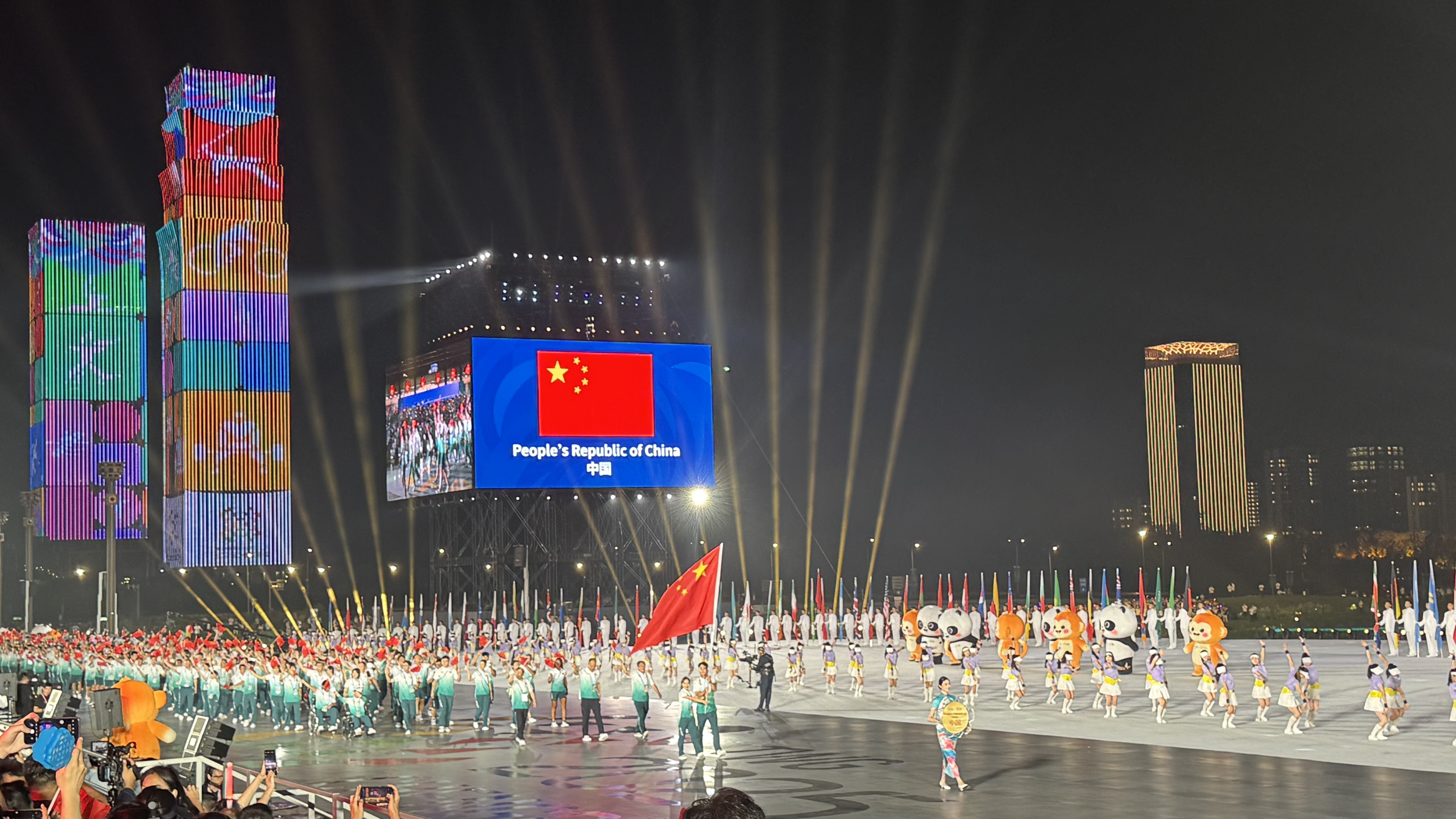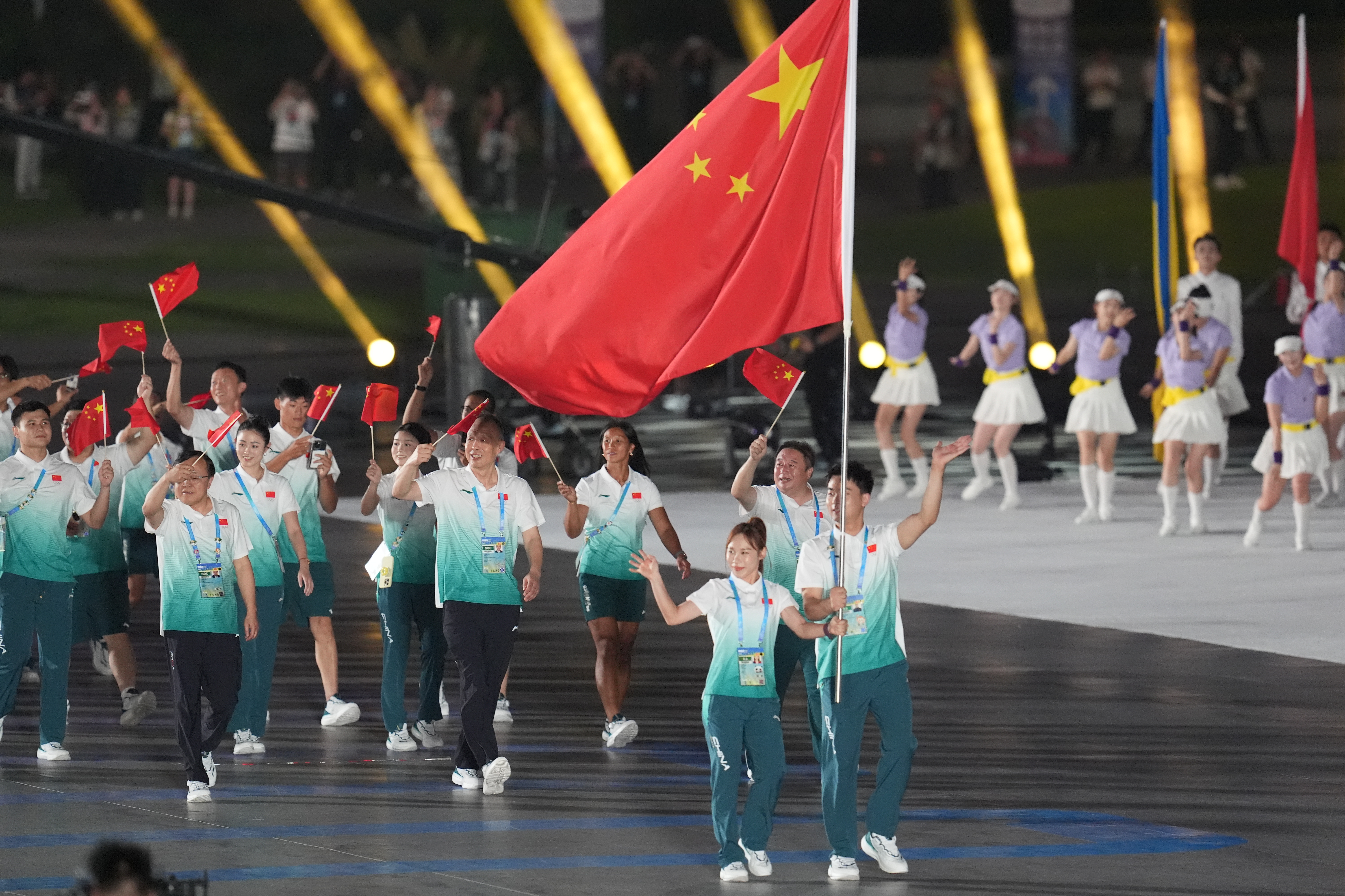 第12届世界运动会开幕式今晚在四川成都举行。开幕式上,伴随着《茉莉花》的动人旋律,东道主中国代表团入场。