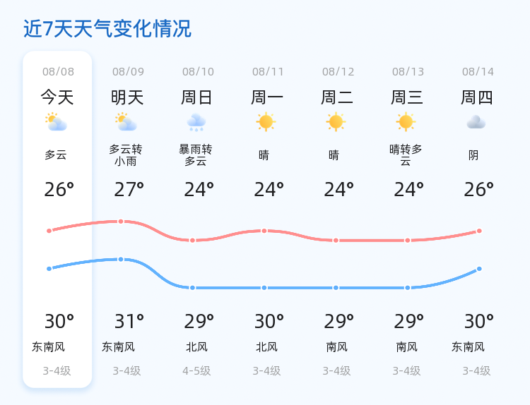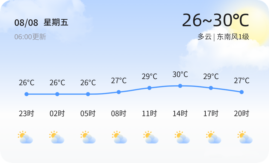 今天是8月8日,星期五,农历润六月十五。青岛市今日以多云天气为主,气温较为舒适,全天温度在26℃至30℃之间。各区天气状况基本一致,东南风1级,空气湿度为79%,PM2.5指数为21,空气质量良好。市民们可以享受这份难得的清凉与舒适。