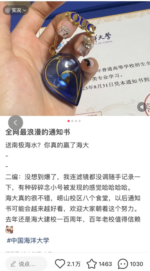 近日,有网友分享中国海洋大学的录取通知书礼盒,礼盒包含了一枚装着南极海水的水滴形吊坠,不少网友称其为“全网最浪漫的录取通知书”。