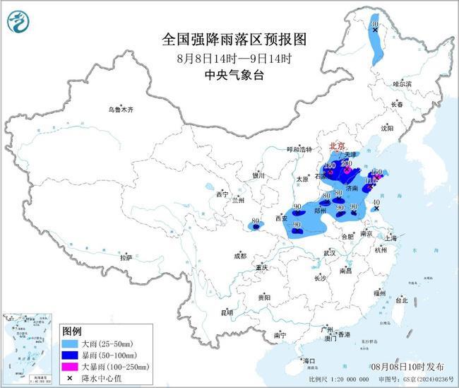 中央气象台继续发布暴雨黄色预警:预计,8月8日14时至9日14时,内蒙古东北部、北京西部和南部、天津中南部、河北中南部、黄淮大部、江淮北部、湖北北部等地部分地区有大到暴雨,其中,河北中南部、山东北部和东部等地部分地区有大暴雨(100~200毫米)。上述部分地区伴有短时强降水(最大小时降雨量20~50毫米,局地可超过80毫米),局地有雷暴大风等强对流天气。