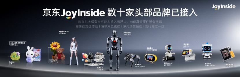 目前已有数十家头部品牌接入京东JoyInside,包括陪伴类的Fuzozo芙崽、火火兔;教育领域的元萝卜AI、京东方、心大陆、灵宇宙、Folotoy、噜咔博士;产业领域的众擎、云深处、魔法原子。近期,还将接入逐际动力、帕西尼机器人等。面向更多企业,京东还开放限时免费接入。