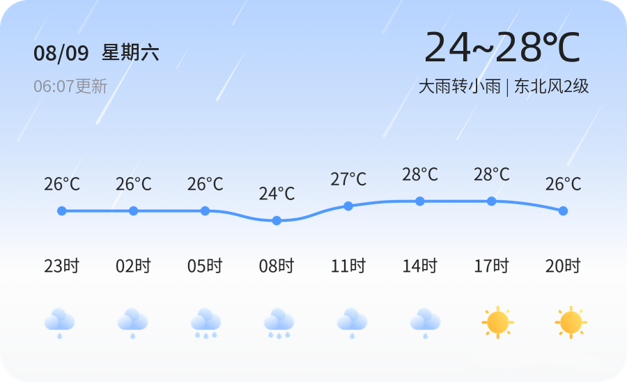 未来三天,滨州市天气趋势为8月9日大雨转小雨,气温24-28℃;8月10日小雨转多云,气温22-29℃;8月11日多云,气温22-31℃。博兴县气象台已将暴雨黄色预警信号升级为暴雨橙色预警信号,预计未来3小时内,博兴县大部分镇和街道仍将有小到中雨,累计降水量可能达到或超过50毫米。市民需注意防范强降雨可能引发的城乡内涝、山体滑坡等次生灾害,避免在低洼地带停留。