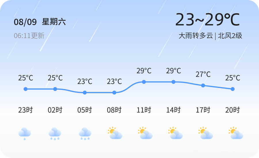 今天是2025年8月9日,农历润六月十六,星期六。德州迎来了一场强降雨天气,早晨以大雨为主,随后转为多云,气温在23℃到29℃之间,北风2级,湿度达到100%,空气质量良好(PM2.5为25)。这场降雨虽然为城市带来了清凉,但也给市民的出行带来了不便。由于降雨强度较大,部分路段可能出现积水,建议市民出行时携带雨具,减速慢行,注意安全。