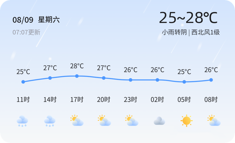 今天是8月9日,星期六,农历润六月十六。济宁市今日天气为小雨转阴,气温在25℃至28℃之间,西北风1级,空气湿度高达96%,PM2.5指数为20,空气质量为优良。今日降雨天气可能对市民出行造成一定影响,建议市民携带雨具,注意交通安全。