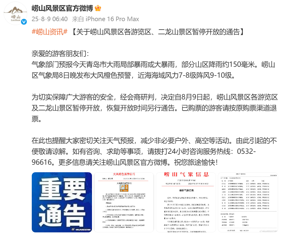 在此也提醒大家密切关注天气预报,减少非必要户外、高空等活动。由此引起的不便敬请谅解。如有咨询、求助等事项,请拨打24小时咨询服务热线:0532-96616。更多信息请关注崂山风景区官方微博。祝您旅途愉快!