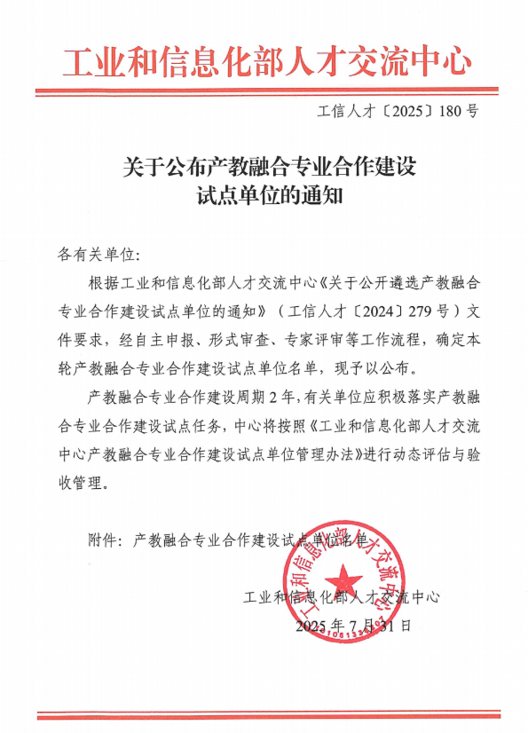 近日,工业和信息化部人才交流中心发布《关于公布产教融合专业合作建设试点单位的通知》。枣庄职业学院应用化工技术和机电一体化技术专业经学校申报、形式审查、专家评审等成功入选试点单位名单。