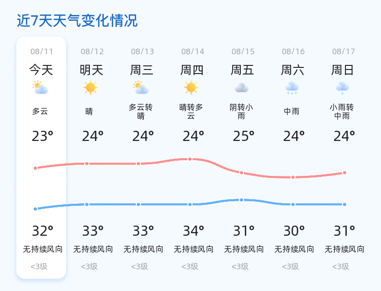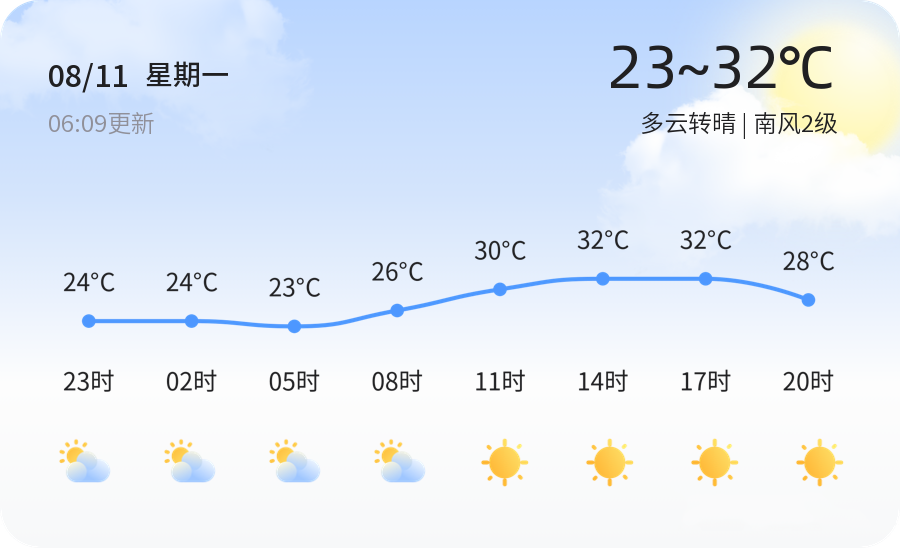 今日是8月11日,农历润六月十八。聊城地区天气多云转晴,气温在23℃至32℃之间,南风2级,空气湿度较高,达96%。目前实时温度为22.9℃,空气质量良好,PM2.5指数为48。全市各区天气状况基本一致,以多云转晴为主,气温适宜,适合户外活动。