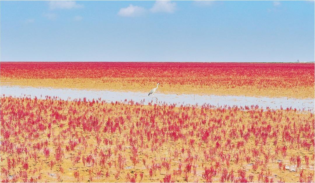 8月10日,黄河三角洲国家级自然保护区内,火红的盐地碱蓬在滩涂绵延,不时有鸟儿栖息觅食。
