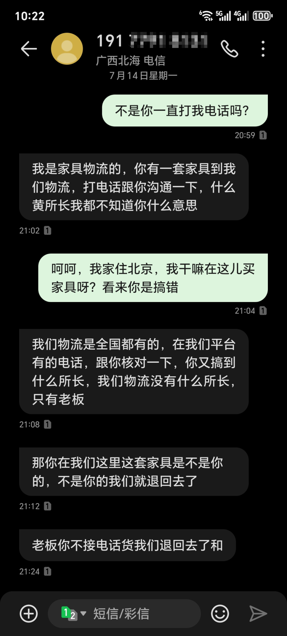 “就在我和他们所长通话的同时,又有一个191打头北海的号码不断往里打,我不接,又给我发信息问‘你家在哪住?我们这有一批家具要给你送去。’我怎么会订家具呢?”