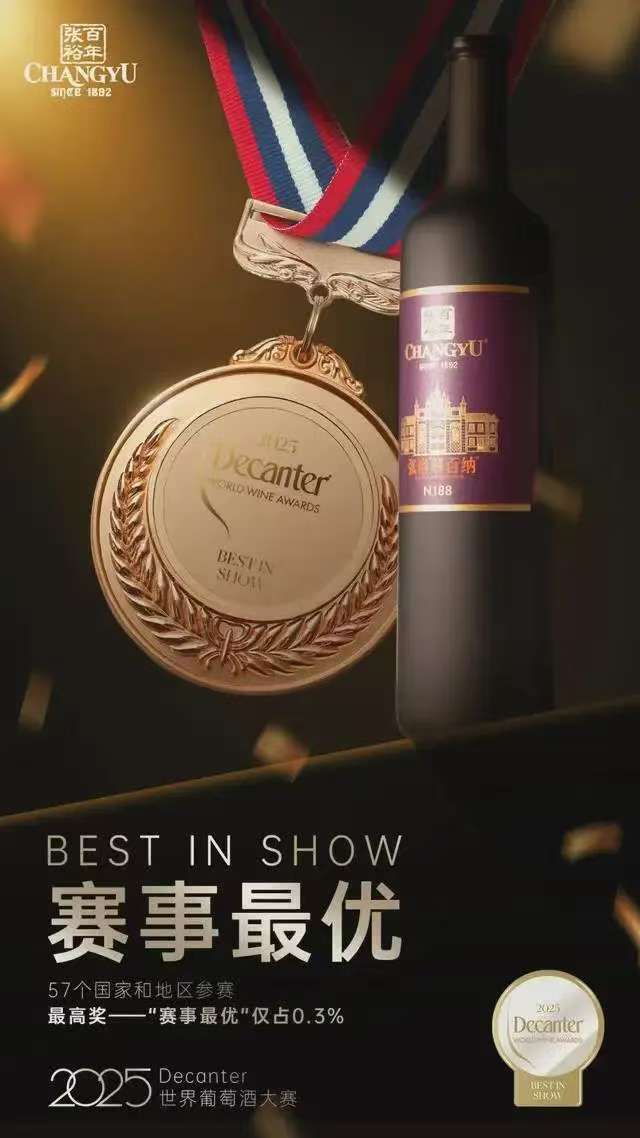 2025年6月18日,全球规模最大、影响力最广,以其严格的评审流程著称的葡萄酒顶级赛事——Decanter世界葡萄酒大赛揭晓年度榜单。张裕解百纳N188以绝对高分斩获“赛事最优”奖,这是自2016年大赛设立该奖项以来,中国葡萄酒首次摘得这一全球顶级荣誉。