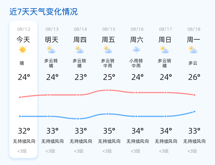 今天是8月12日,星期二,农历润六月十九。济南市今日天气晴转多云,气温在24℃至32℃之间,东南风2级,空气湿度为82%,PM2.5指数为26,空气质量良好。各区天气情况总体平稳,以晴到多云为主,局部地区可能出现短时多云,但对市民生活影响不大。