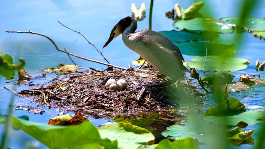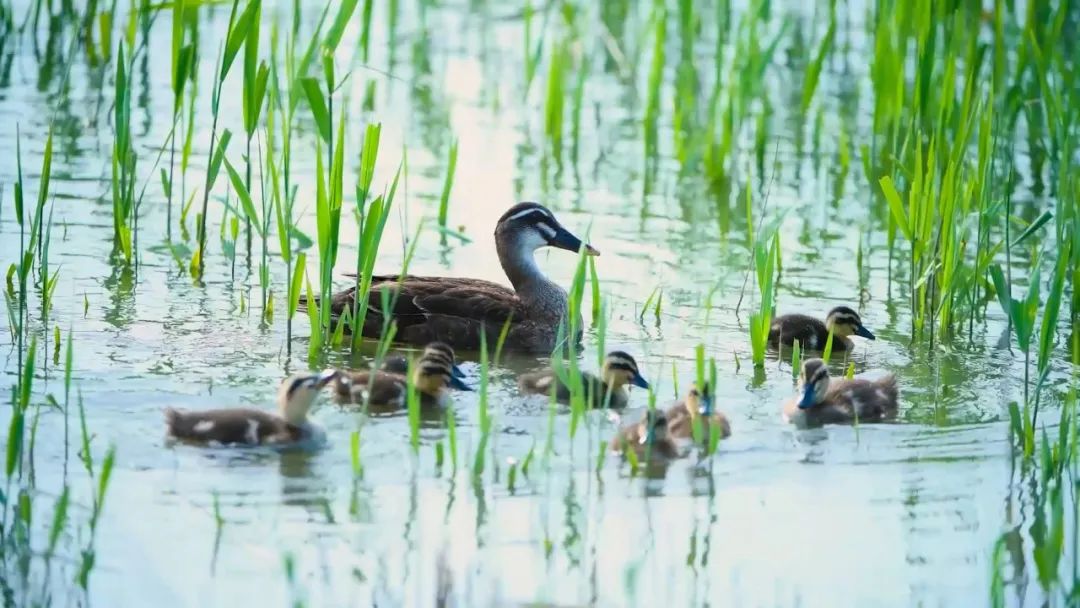 水面上黑天鹅、鸳鸯、非洲雁、绿头鸭等鸟儿悠然栖息。