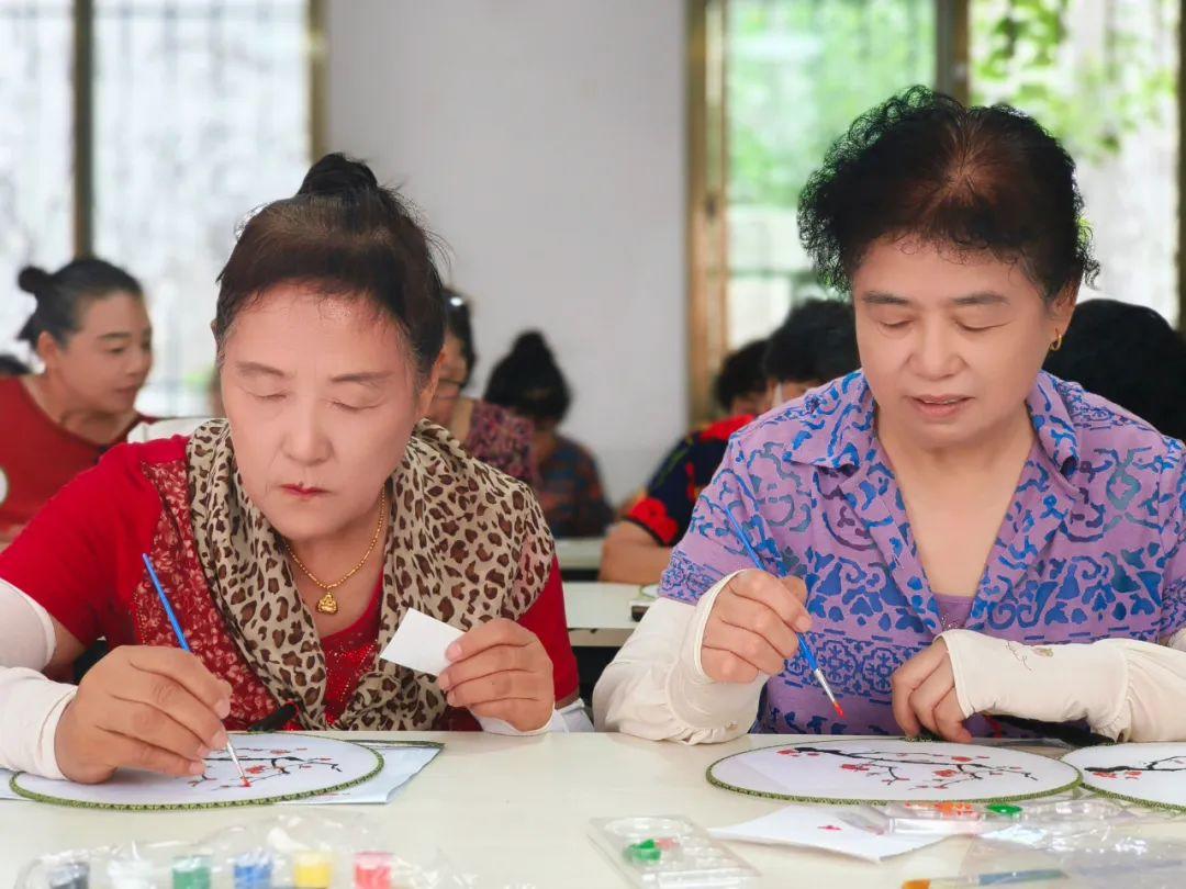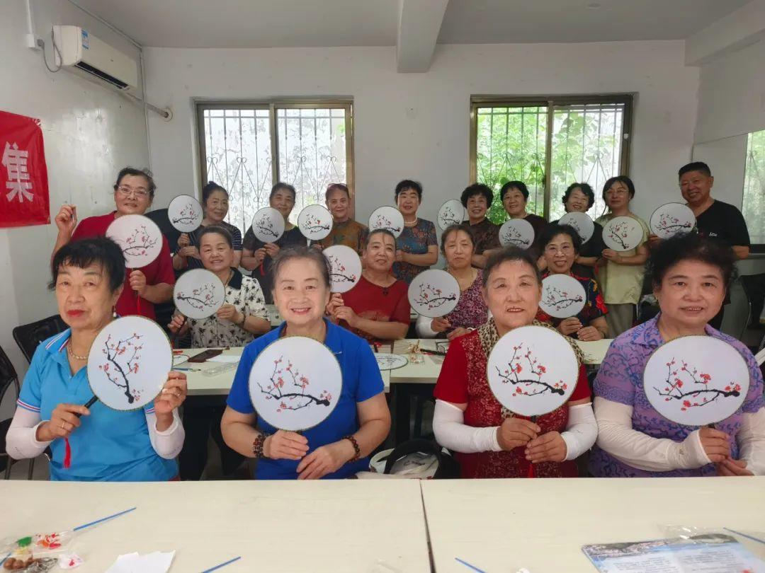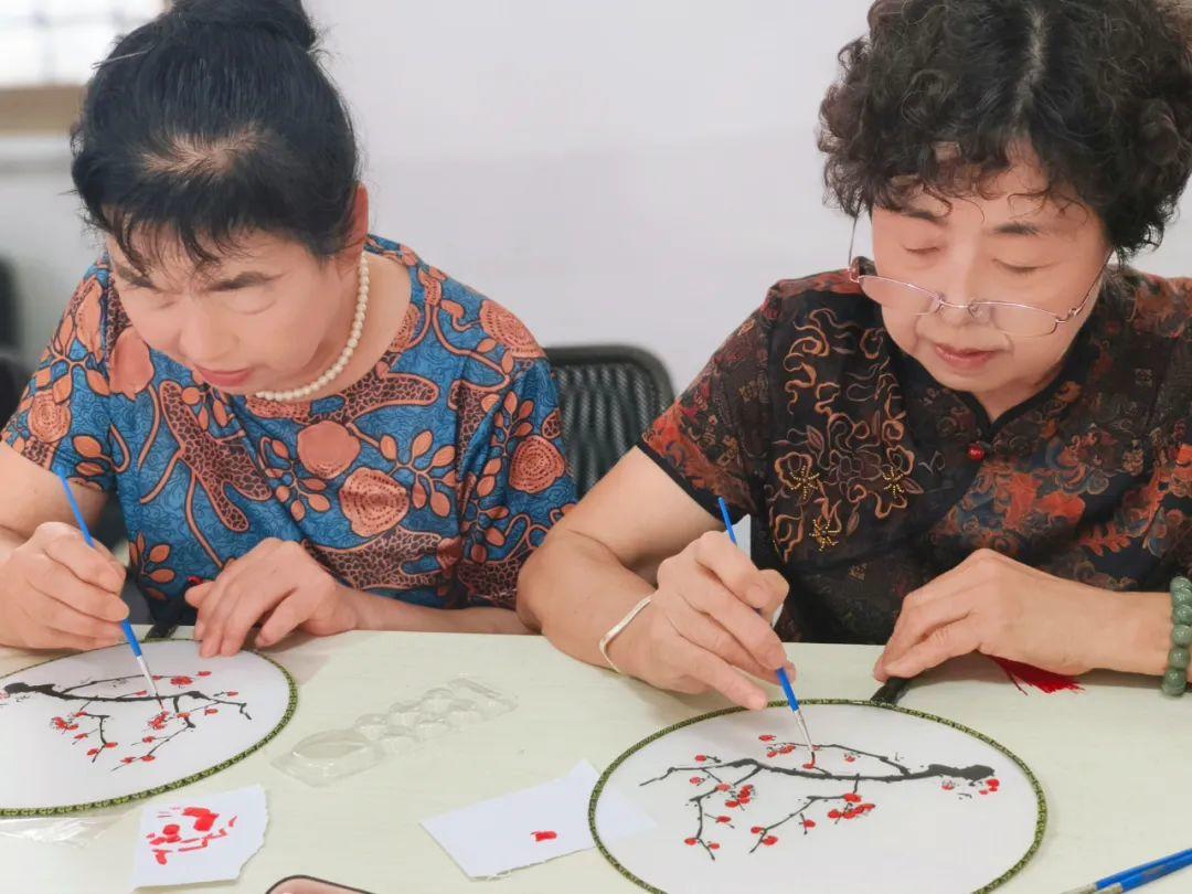 活动现场,素扇、缤纷颜料、精致画笔整齐排列,等待居民们的创作。社会组织负责人于老师先介绍扇子的历史文化,再细致讲解色彩搭配与填色技巧,让零基础居民也能轻松上手。居民们拿起画笔,在素白的扇面上勾勒梅花的轮廓,一边创作,一边交流心得。欢声笑语中,邻里情谊悄然升温。经过一番精心绘制,原本素净的扇子焕然一新,五彩斑斓的梅花在扇面上绽放,每一把都独具特色。