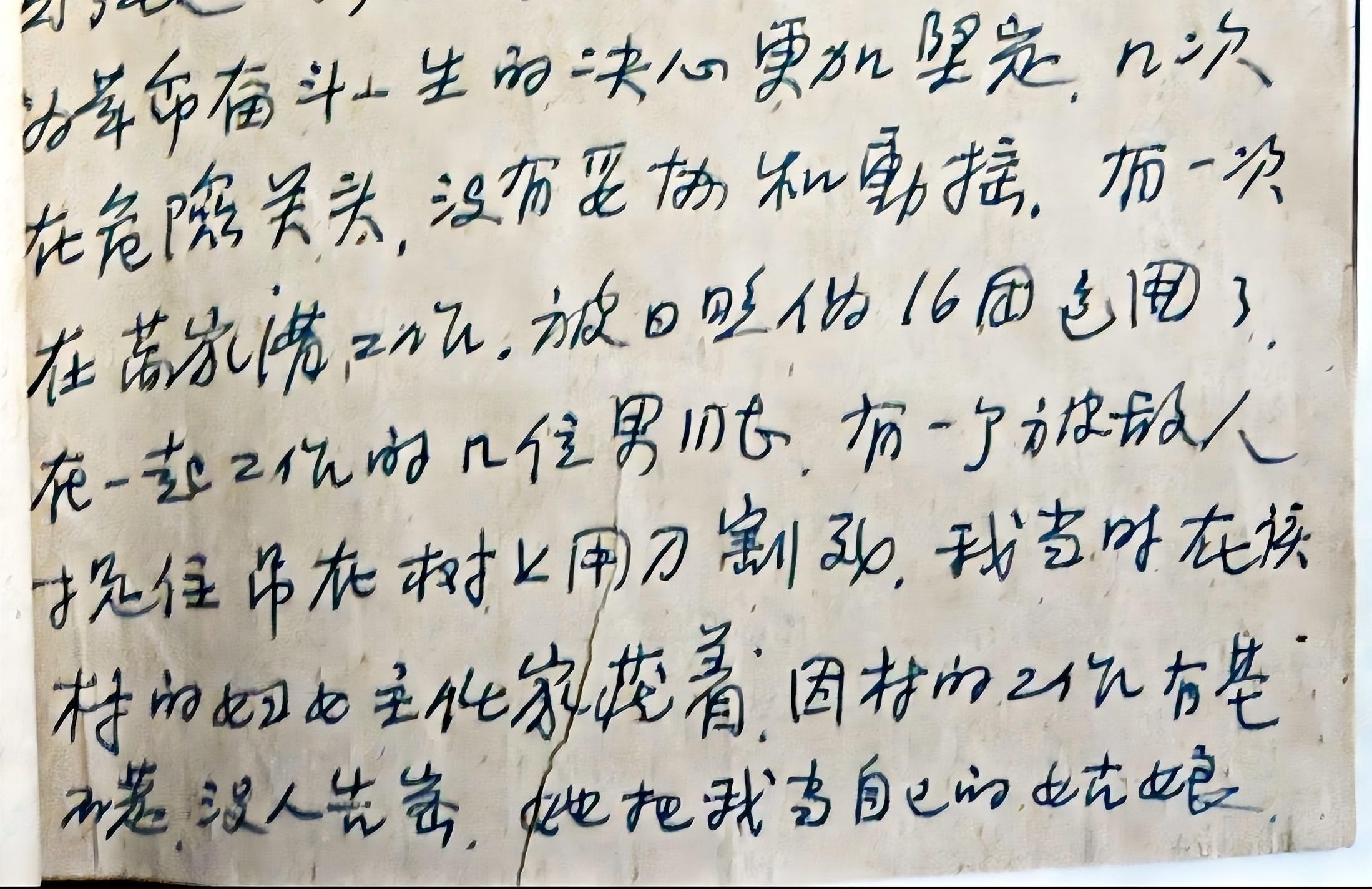 “一次在万家沟工作,被日照伪16团包围了,在一起工作的几位男同志,有一个被敌人捉住吊在树上用刀割死,我当时在该村的妇女主任家藏着,因村的工作有基础,没人告密,她把我当自己的姑娘,混了敌伪军的耳目,没有被发现,当时还有两个女同志,因逃跑时暴露,被敌伪军捉去铡死了,事后,就有个别同志妥协回家,我当时没有动摇,仍坚持在原地区工作”。