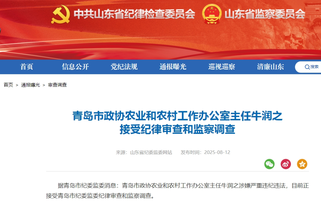 青岛市政协农业和农村工作办公室主任牛润之被查