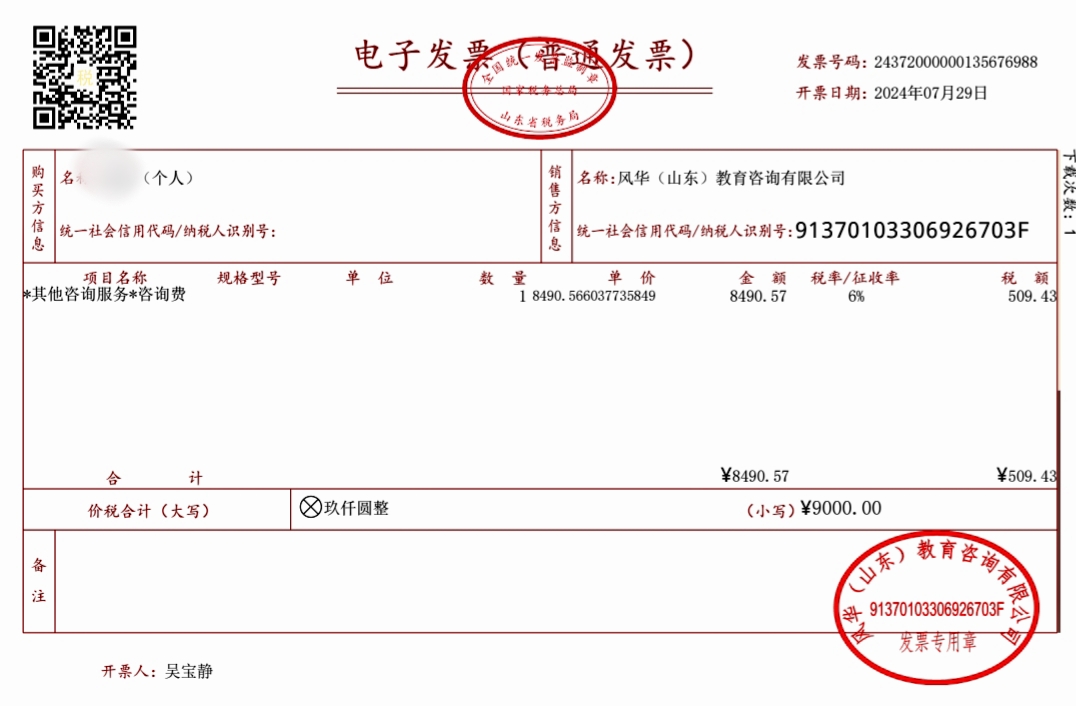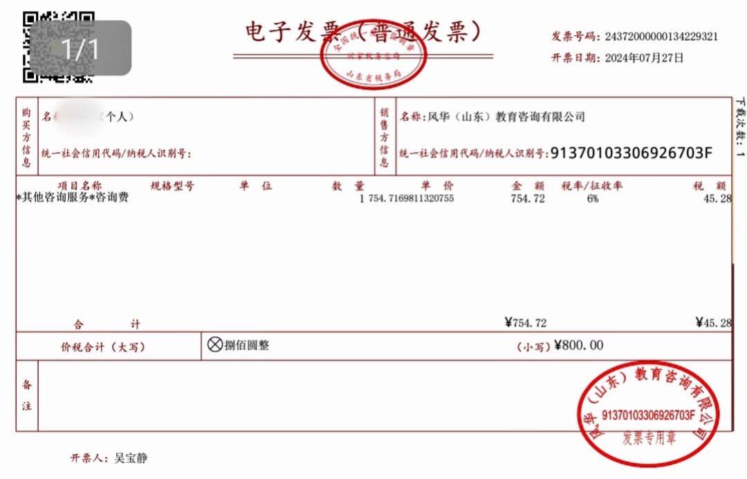接下来的日子,徐老师天天联系他,把自考政策的“优势”掰开揉碎了讲。王先生越听越觉得靠谱,跟家人商量后决定报名。为了保险,他还特意开车跑到济南市槐荫区的风华(山东)教育咨询有限公司办公地点查看情况,当时分两次缴了800元和9000元,拿到的电子发票上,两笔费用的项目均标注的是“其他咨询服务*咨询费”。