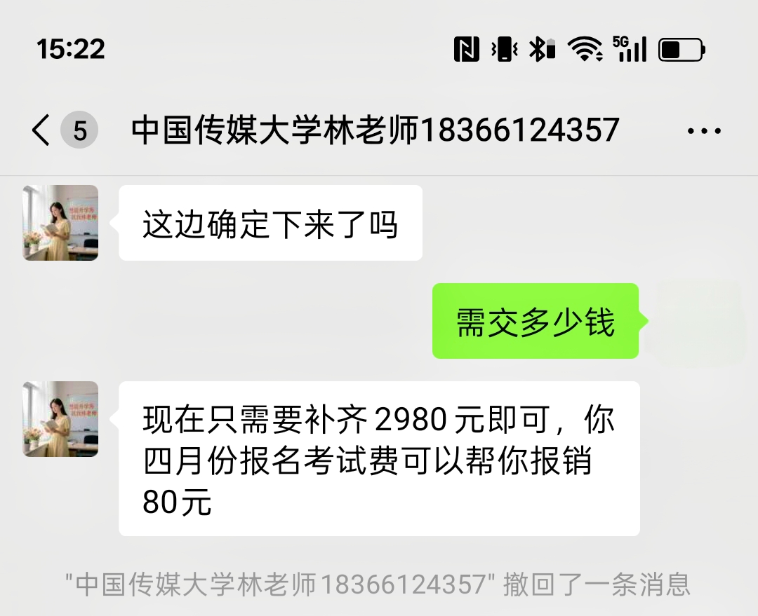 缴费后,一位姓林的女老师成了他的“班主任”,说会负责指导学习、复习、报名和缴费。可实际情况是,除了收到4本教材,林老师几乎没提供过实质性帮助,每次联系都是催缴考试费——每科80元。2025年4月的首次考试,王先生因为生病没参加;6月身体好转后,他又收到林老师的微信,催缴10月的考试费。这次他报了两科,缴了160元,可当他想打电话咨询考试细节时,林老师的手机号已成空号。