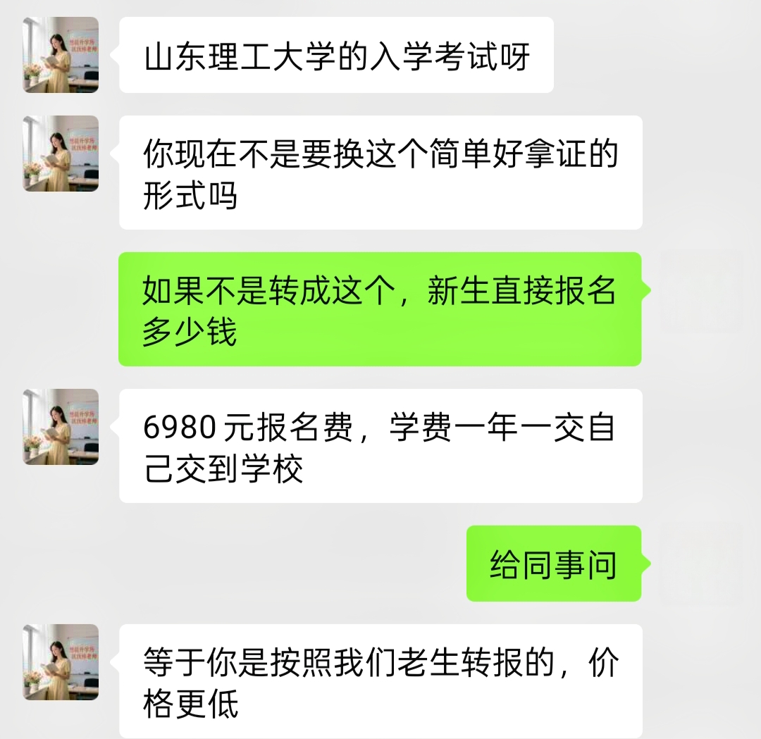 更让王先生起疑的是,这位新老师建议他放弃自考,改报成人高考,说山东理工大学的文史类专业相对简单,鉴于他是老考生可再缴2980元报名费就能改为成人高考,如果是新考生就需缴纳6980元方可报名,如不能介绍考生来报名,还可以给发300元红包。“改什么专业?报哪所大学?再交钱拿不到毕业证咋办?”满肚子疑问的王先生,特意咨询了山东理工大学继续教育学院的定点报名处,得到的答复让他后背发凉:“专升本成人高考报名费只要430元,录取后学费直接交给学校,2980元明显存在套路。”