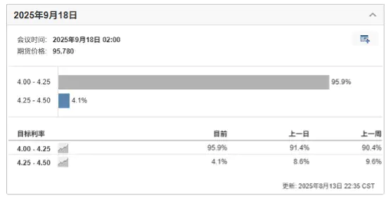 根据CME FedWatch工具的交易数据,交易员目前预测美联储在9月会议上降息的可能性已经超过95%。