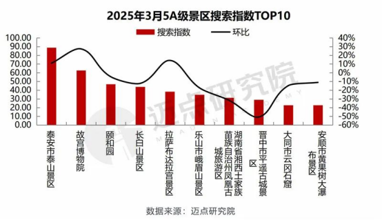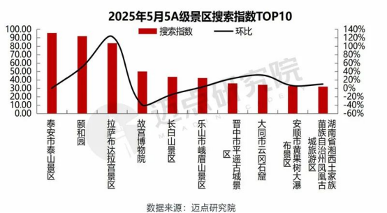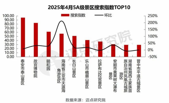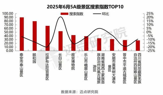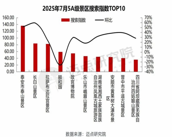 根据榜单,7月,5A级景区中搜索热度前十的分别是:泰安市泰山景区、长白山景区、拉萨布达拉宫景区、颐和园、故宫博物院、乐山市峨眉山景区、湖南省湘西土家族苗族自治州凤凰古城旅游区、安顺市黄果树大瀑布景区、晋中市平遥古城景区、四川省阿坝藏族羌族自治州四姑娘山景区。其中,泰山景区和长白山景区搜索指数环比增幅均超50%,游客搜索量攀升。据巨量算数数据,7月泰山景区搜索量环比46.03%,除山东本地游客外,河北、山西、江苏、河南等省份游客对其关注度、出游偏好与意向度较高。