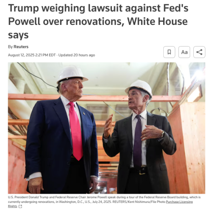 △路透社报道,特朗普若要起诉鲍威尔,仍面临不少法律障碍。