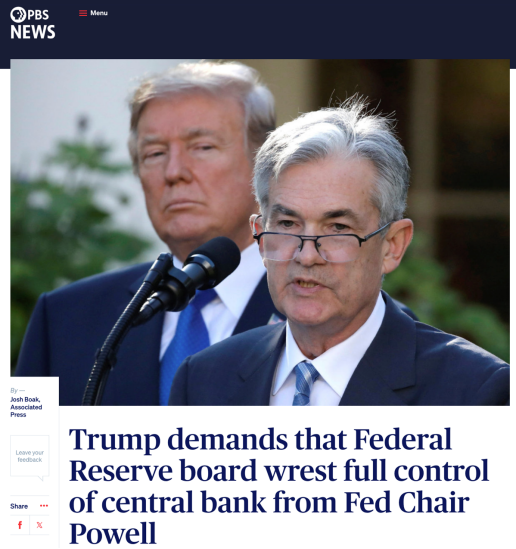 △美国公共广播公司报道,特朗普批评鲍威尔在降息问题上顽固不化。