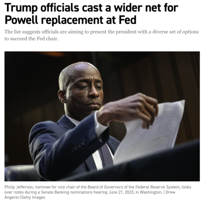 △美国《政治》新闻网站报道,特朗普政府正在拓展接替鲍威尔的人选范围。