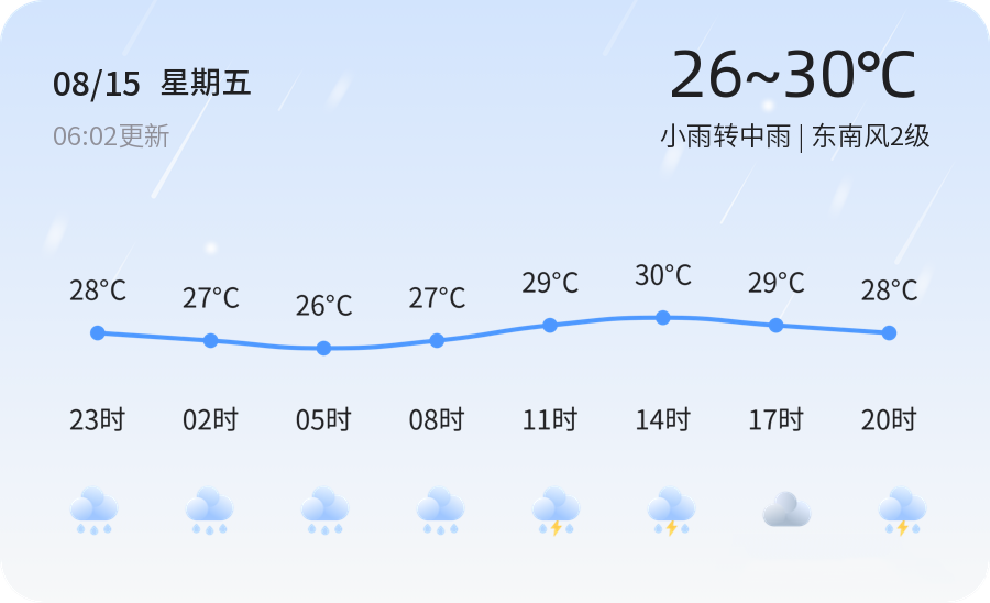 今日是2025年8月15日,星期五,农历闰六月廿二。东营市今日天气为小雨转中雨,气温介于26℃至30℃之间,东南风2级,空气湿度高达89%。空气质量方面,PM2.5浓度为24,属于优级水平。目前气温为26.4℃,市民出行时需携带雨具,注意交通安全。