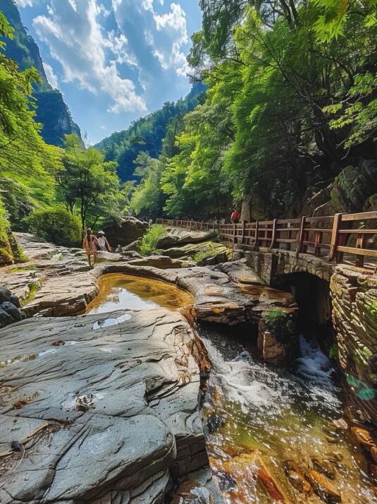 如今的北崔崖村,群山叠翠间,既有蹦极、漂流,又有乡野意趣的民宿。景区特意保留了726米高的牛角山垂直崖壁和200余棵百年黄栌古树,在此基础上打造高空漂流、亲水竹筏等特色项目;生态登山步道串联起黑龙潭、老龙湾等景观,形成完整的生态旅游环线。凭借这份“先天优势”与科学开发,2024年景区接待游客量突破10万人次,综合收入超过500万元。