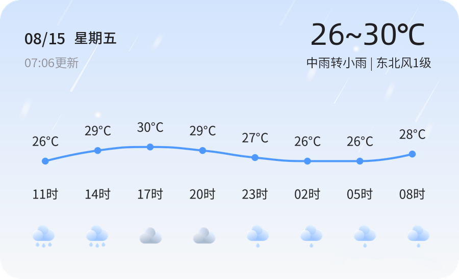今天是2025年8月15日,星期五,农历闰六月廿二。聊城市迎来中雨转小雨天气,气温介于26℃至30℃之间,东北风1级,空气湿度高达89%。空气质量状况为良好(PM2.5指数26),市民外出时建议携带雨具,注意交通安全,以防范降雨带来的路面湿滑。此外,由于今日有雷电黄色预警,市民应尽量避免在户外逗留,确保人身安全。