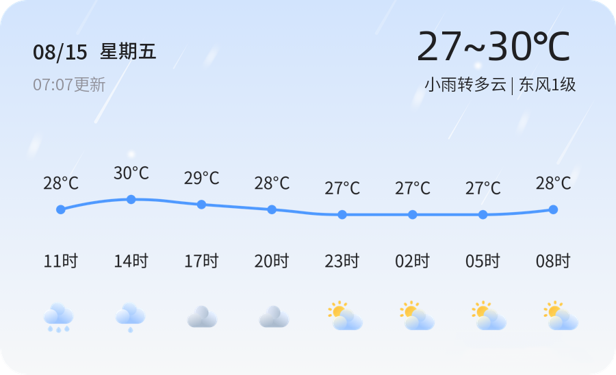 今天是2025年8月15日,星期五,农历闰六月廿二。菏泽市今日天气为小雨转多云,东风1级,空气湿度90%,PM2.5指数为44,空气质量状况为优。今日气温适宜,最高气温30℃,最低气温27℃。市民出行时建议携带雨具,注意交通安全,选择绿色出行方式,如公共交通或步行,以减少碳排放,保护环境。
