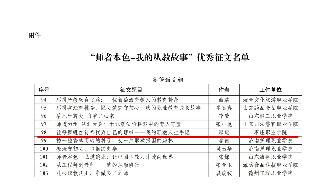 近日,由山东省教育厅主办的“师者本色—我的从教故事”征文活动评选结果揭晓,枣庄职业学院教师郑聪《让每颗螺丝钉都找到自己的螺纹——我的职教人生手记》荣获优秀征文奖,充分展现了学院教师队伍的卓越风采。