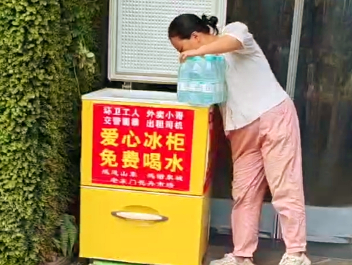 杨女士正向爱心冰柜内补充瓶装水